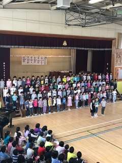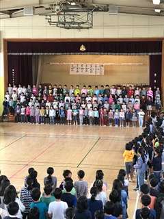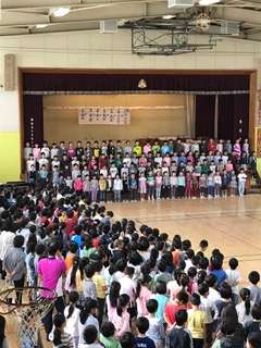 今朝は音楽集会です。1年生が前に並び『君と僕の間に』を歌ってくれました。