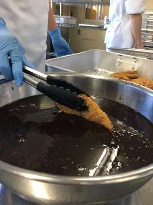 本日の給食はホキのフライです。ホキは淡白な魚なので、下味をつけてから衣で化粧をした後、油で揚げることにしました。