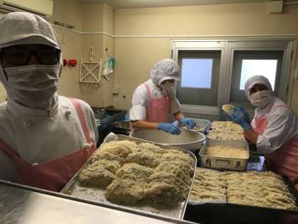 全部で740切れほどの魚を衣付けして、ソースにくぐらせて配缶することは(1時間30分ほどかかるので)簡単ではありませんが、子供たちのためにと、調理員みんなで喜んで作ることができました!!