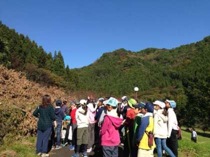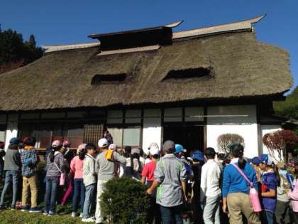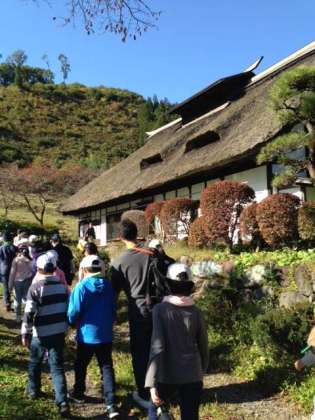 里山体験をしました。本当にいい天気。里山の意味を学び、茅葺屋根の古民家見学をしました。
