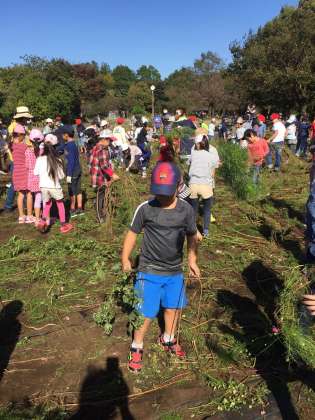 またまた秋らしい青空の下、花の丘活動が行われました。本日は1学期に種を蒔き、綺麗に咲いたコスモスの抜き取りと、来春に向けた菜の花の種の植え付けの二本立てでした。子どもたちは、自分の背丈より高いコスモスの「密林」の中に果敢に入って抜き取りをしました。千歳中の職場体験に来ている中学生にもサポートを受け、しっかり作業を進めていました。
