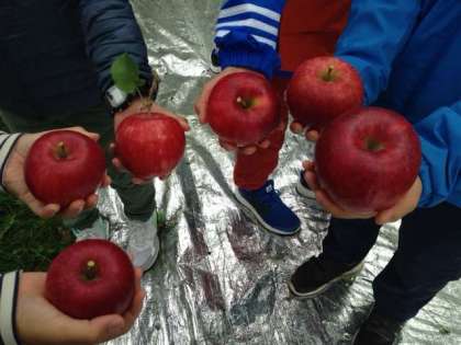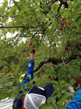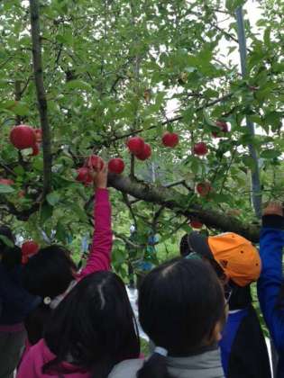りんご園でりんごもぎをしました。赤くて大きくて甘そうなりんごはどれか。よく見極めながら、一人2つずつもぎました。