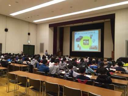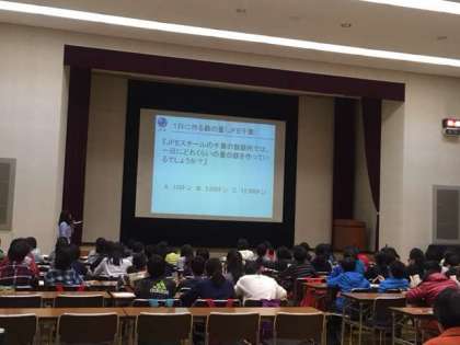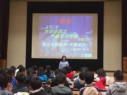 千葉市にあるJFEスチール(東日本製鉄所)株式会社に着きました。高速道路も順調で予定よりも早く到着できてよかったです。まず学習ホールで製鉄所の概要についての説明を受けています。みんな真剣です。
