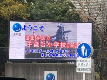 製鉄所の中に入り、実際に鉄ができる工程を目の前で見学しました。その迫力は見た人しかわからない、そんな感じです。直接子供たちから聞いてみてください。日本の工業を支えてきた基幹産業。製鉄所内の重厚な設備、メカニズム、それだけでないこれまで担ってきた役割にも深く感じるものがありました。製鉄所内は撮影禁止で、その写真はご紹介できませんが、入り口には千歳台小学校の表示をしてくださり、歓迎していただきました。
