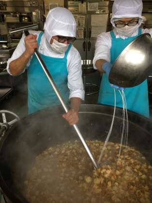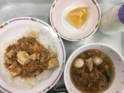 今日の目玉はなんといっても麻婆豆腐丼です。麻婆豆腐は豆腐を切るところから勝負が始まります。いつもより少しだけ大き目にきった豆腐の水気を切り、釜に移していきます。この時、豆腐が崩れないよう優しく扱います。その後、一番の山場がやってきます。それは、かたくり粉でとろみをつけることです。大きな釜で混ぜると、豆腐はほかの具とぶつかって崩れてしまいがちですが、かたくり粉をゆっくりと入れて混ぜることで、それをできる限り防ぐようにして作ってみました。混ぜ終わった豆腐を見ると、大方形が残っています!素晴らしい!調理員に思わずグッドサインを送りました。バットに移す時まで丁寧に扱い、みんなのもとへ届けました。