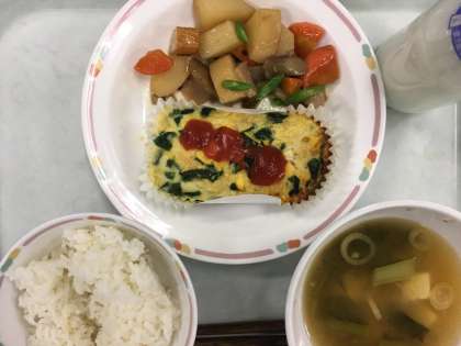 給食は、一番おいしい食材を味わってほしいと考えて、できるだけ旬の食材を取り入れるようにしています。では、今日の旬の食材はというと、冬にたくさん採れるほうれん草と小松菜です!!ほうれん草は色味を活かして卵焼きに、小松菜はシャキシャキした味が残るように味噌汁に入れました。ランチルームでは旬の話をしたら、みんなは喜んで「じゃあ残さず食べたい!!」といって、旬の食材を楽しんで食べてくれました。