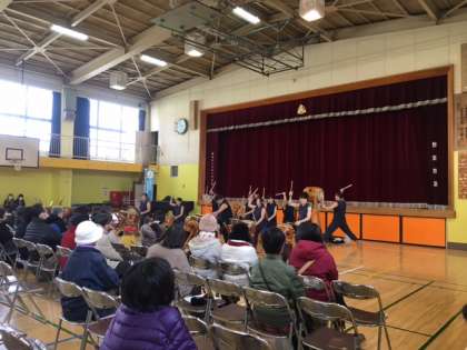 先日行われた船橋地区社会福祉協議会地区交流会の様子です。100人をこえる参加者の前で『深沢高校和太鼓部卒業生チーム』の皆さんが和太鼓の演奏を披露してくださいました。