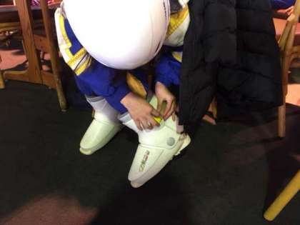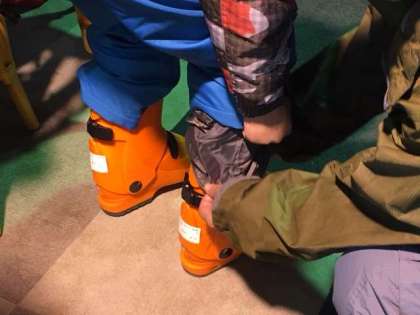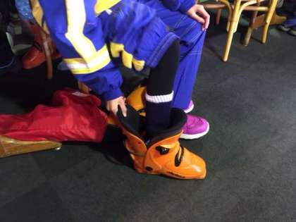 さあ、いよいよスキーの準備。スキーブーツを履くのも初体験という子供も少なくありません。大人の皆さんにも覚えがあることと思います。デバンデスのお父さんにも手伝ってもらいました。