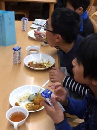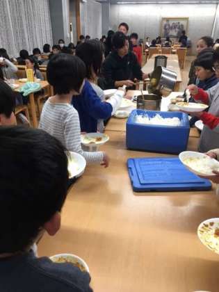 夕食はカレーです。秋に飯盒炊爨したメニューをもとに宿舎の方が作ってくださったものです。デザートにバナナがでます。みんなお腹ぺこぺこといった感じでお代わりの行列ができています。けが、病気は現在一人もいません。みんな元気です。このあとお風呂に入ります。温泉です。