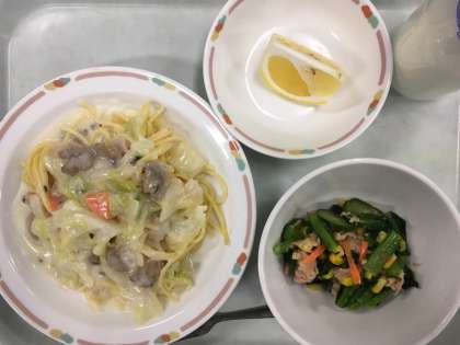 今日の一押しはクリームパスタです。これは冬の食材であるキャベツをおいしく食べてほしいと思って考えた料理。実は千歳台小学校では初めてだすメニューなのです。調理員と試作をすると、「少しルーが麺となじむようとろみを抑えたほうがいいかも」といった意見や、「キャベツは水気が出るから最後に蒸したキャベツを入れる方がおいしくなると思う!」といった意見が出ました。挙がった意見を活かしていざ本番!5年生の男の子に聞くと、「めちゃおいしかった〜!!」と嬉しい感想をいただきました。しかし、少し課題も残りました。なぜなら職員室では、「少し薄味だった」という意見が多かったからです。どうやらキャベツから水が出てしまった可能性があります。「じゃあどうしようか!?」次回のパスタに向けて、今日も厨房では作戦会議が開かれていました。