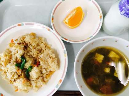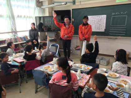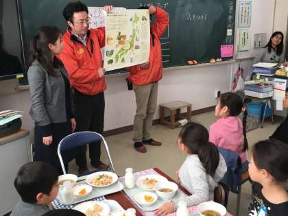 「みなさん、今日のフルーツの名前は何かわかりますか?」はるかかな…みかんかな…頭を斜めにして考えるのは1年3組のお友だちです。質問を投げかけるのは毎日給食の食材を届けてくださっている業者の方。普段届けている食材を子供たちがどれだけ楽しみにしているかを一緒に食べることで見ていただきたいと考えて招待させていただきました。「正解は清見です!今日の清見は和歌山県でとれた果物だよ」という説明を聞くと、頭をうんうんさせながら聞いてくれました。説明をきいたみんなは興味津々。清見のことを知ったみんなはお代わりするほど全部食べてくれました。