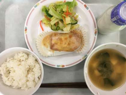 今日の一番はなんといっても鶏のチーズ焼きです。こだわったポイントは2つ。一つは下味です。醤油やみりんで2時間漬け込み、どこの部分を食べたとしても、味がするよう工夫しました。また、二つ目はチーズの焼き目です。鶏肉にチーズをのせて焼くと、鶏に火亜しっかりと通るころにはチーズが焦げすぎてしまいます。そのため、最初に鶏肉だけで2分焼き、その後チーズをのせて8分230度で焼きました。ほんのりチーズに焼き目が付いたところで火を止めて、冷めないうちに素早くバットに敷き詰めました。今日は放送委員のお友だちのところ直撃。「先生、鶏まじうまいっす!」とグッドサインを送ってくれました。チーズ焼きへのこだわりが今回成功してよかった!!心から嬉しくなりました。