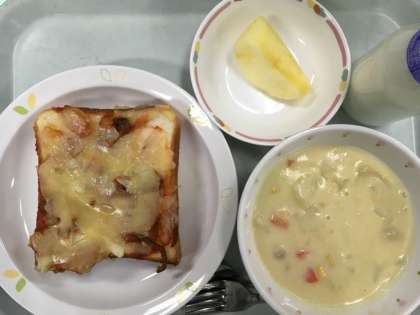 毎朝、学校に着くまでに会う2年生の女の子がいます。「おはようございます。」の次にいつも聞く質問があります。それは、「今日の給食はなんでしょう!?」という問題。いつもなら二つ返事に「わかんな〜ぃ。先生教えて!」となっていたこのやりとりですが、今朝の彼女は一味違いました。信号先に大きく手を振る女の子。まだ遠くにいるのに、大きな声で私の名前を呼んでいます。「先生聞いて〜〜!!」信号を小走りでわたり終えると、腕をがっしりとつかんで、「先生、今日は全部覚えてきたよ!今日の献立はピザトースト、コーンシチュー、りんご!全部大好き!」とこぼれるばかりの笑顔で教えてくれました。ついに献立を見てから登校してくれた!!と心にグアっと込み上げてくる喜び。「よく覚えてきたね!ありがとう!!とっても嬉しいよ!」と思わずハイタッチをしました。正門をくぐると、「先生、給食楽しみにしているね!」と元気に教室に向かう彼女の背中に、今日も頑張ろう!と小さくこぶしを握る朝でした。