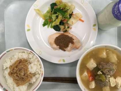 ランチルーム給食では今日も食育クイズが始まりました。「さて、今日は魚の漢字クイズです。いわしは魚へんの隣にある漢字が入ります。それは何でしょう?」みんなは思い思いに漢字を発表してくれました。「冬!秋!夏!」月曜日、鰆の漢字は魚へんに春だという説明をしたので、みんなどうやら季節が入ると予想した模様。「正解は弱いという漢字です!」と伝えると、「イェーイ」と「えー!?」の二つが飛び交いました。今日はそんな鰯をたくさん使ったつみれ汁。苦手な人も少し見受けられましたが、多くのお友だちがモリモリ食べてくれました!