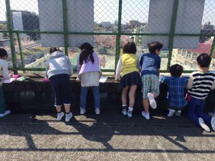 みなさんお早うございます。3年生に進級、社会科が始まりました。先ずは学校の周りの様子を観察します。南側には何が見えるかな?