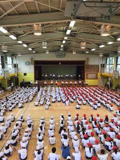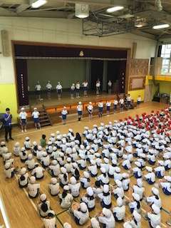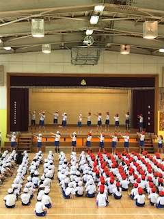 今朝は運動会に向けて、体育朝会です。運動会同様に紅白に分かれて並んでます。今朝はラジオ体操の練習。
