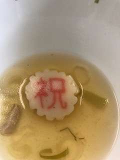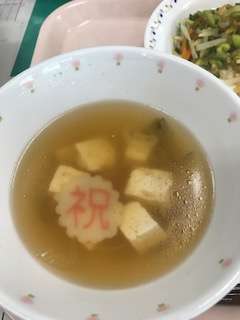 今日の給食は『お祝いすまし汁』ということで、『祝』と描かれたナルトが入っていました。千歳台小学校、38歳おめでとう。