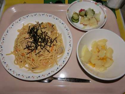 海苔の風味を味わってほしいと思い、から煎りした後に別にとっておき、教室でスパゲティの上にかけてもらうことにしました。今までと違った配膳になりましたが、子どもたちは喜んで自分たちで海苔をかけている様子が見受けられました。