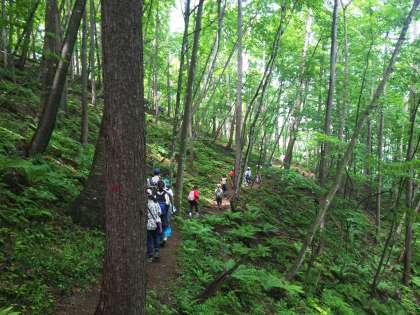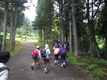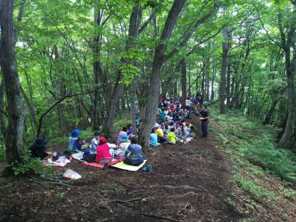 登山に出発しました。途中急な坂もありましたが、みんな頑張って頂上につきました。ビレジでもらったお弁当を食べました。