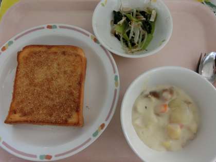 今日は焼けたパンとごまが香ばしいセサミトーストです。「バター・砂糖・すりごまを混ぜて、パンに塗って焼くんだよ」と教えると、子どもたちは「家でも作れそう!」と驚いていました。ぜひご家庭で子どもと一緒に作ってみてください。