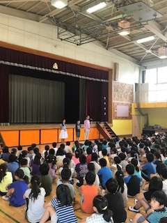 6月19日全校朝会。校長先生から『夏至』についてお話があったあと、今朝も6年生のスピーチです。『地球温暖化防止について調べてみました。自分たちで出来ることをしてみんなで地球温暖化を防止しましょう』