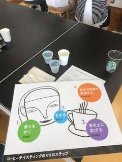 コーヒーのテイスティングにチャレンジ。芦花公園の店長さんは、コーヒーを通じて世界平和に貢献したいと話してくれました。コーヒータイムでみんな仲良くということですね。