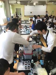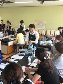 参加出来た皆さん、興味津々でお話を聞いてます。今、千歳台小の家庭科室は確かに平和です。