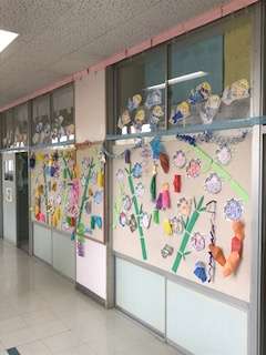 1年生の廊下の掲示です。上段には水泳の目当てを、下段には七夕の笹飾りと願い事の短冊を飾っています。