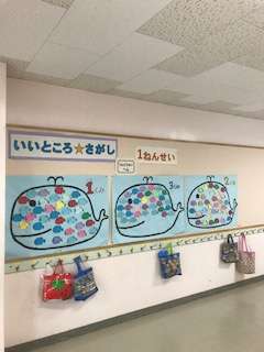 すまいる学級に向かう壁面には1年生のいいところ探しの掲示があります。