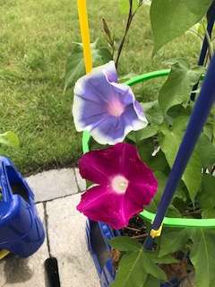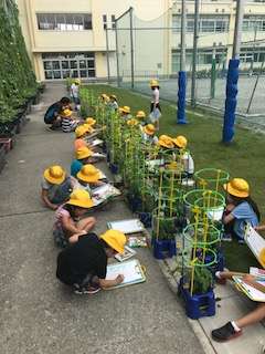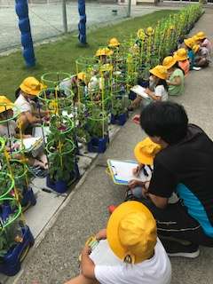 1年生が行儀よく並んで観察中。大事に育てたアサガオが綺麗な花を咲かせています。よーく見てごらん。何が見えるかな?一生懸命観察してそれを観察ノートに記録しています。