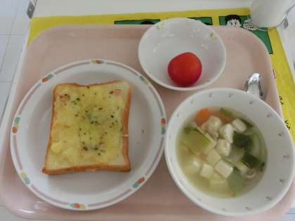 たまねぎ・じゃがいも・ベーコン・マヨネーズ……鉄板の組み合わせをトーストにのせて、さらにチーズをかけて焼きあげたポテマヨトーストは、子どもたちに大人気!おかわりじゃんけんをしているクラスもありました。