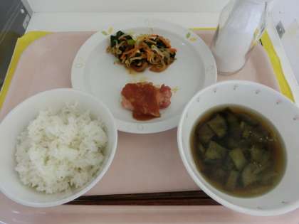 給食の汁物がいつも具だくさんなのは、身体に必要な栄養をたくさんとってほしいからです。しかし「○○のみそ汁(すまし汁)」と銘打っても、他にもたくさん具が入っているので代わり映えしにくいのが困ったところ。そこで今日は「なすのみそ汁」の主役のなすを多めに、具の種類を少なめに調節してみました。