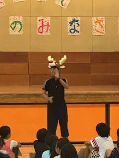 今日はプールで交流会の予定でしたが雨天のため室内レクレーションに変更です。トナカイさんが登場してレクレーションを盛り上げてくれています。