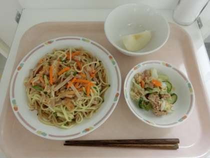 麺、具、タレと冷やすものが多いので、調理員さんには手順をよく確認して作業にあたってもらいました。おかげでおいしい「冷やし」中華になったと思います。子どもたちにも大変好評で、クラスによってはおかわりに列ができたところもありました!