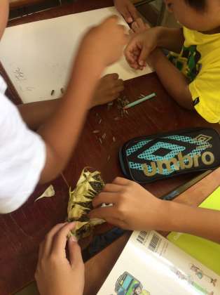 春から育てたヒマワリが頭を垂れて沢山の種ができました。理科では一つの花(実はそれ自体花の集合ですが)にいくつくらい種ができたか数えてみました。結果は何と1531個!植物はこの様に一つの種から沢山仲間を増やすことを学びました。