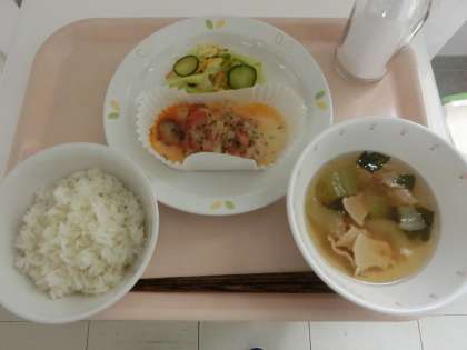 今日は鶏肉にトマトピューレや野菜を炒めたソースをかけて、チーズをかけて焼いたピザ風焼きです。子どもたちにはとても人気で、すぐに食べ終わってしまい「もっと食べたい!」という子も。おかわりの時間が待ち遠しいのはわかりますが、一口一口よく噛んで味わって食べてほしいと思います。