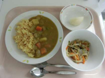 10月の読書月間にあわせて、今日は本の中に登場する料理を献立にしました。「うちにかえったガラゴ」という絵本に登場する、こみみさんというキャラクターが大鍋で持ってきたカレーです。このカレーについては特に詳しく描写されていないので、絵を見てなるべく近づけるように作りました。ご飯がターメリックライスのように黄色かったので、カレー粉やトマトピューレで色をつけて、カレールーにはグリンピースや小さく切った野菜を入れました。