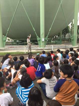 そして、いよいよガスホルダーの見学へ。普段は入ることが出来ない施設内に入れていただきました。近くで見ると、迫力がありました。高さ36メートルもあるそうです。子どもたちが疑問に思っていたことを事前に伝えていたので、そのことを中心にお話しいただきました。15年に一度ガスを全て抜いて中の点検をするそうです。近くで見たことによって、DVDの中に出てきたガスを送るホースや火事の時に作動するスプリンクラーのようなものを見つけることができました。