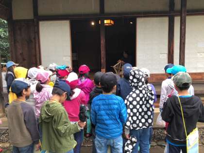 少しまだ雨模様ですが、3年生は元気に区内巡りをしています。最初の目的地は次大夫堀公園。昔に戻った気分で古民家を見学しました。