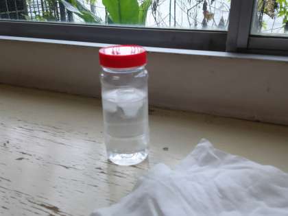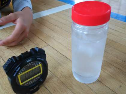氷水の入った容器に、水滴が着くことを通して確かめました。