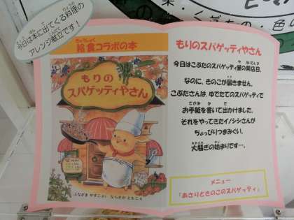 今日は図書コラボ給食第2弾です。「もりのスパゲッティやさん」に出てくるメニューの一つで、きのこが秋らしくていいなと思い実施しました。
