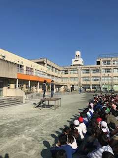 今週も千歳台小学校の1週間は6年生のスピーチから始まりました。体育館は展覧会の作品が並び始めていますので、今朝の朝会は校庭です。