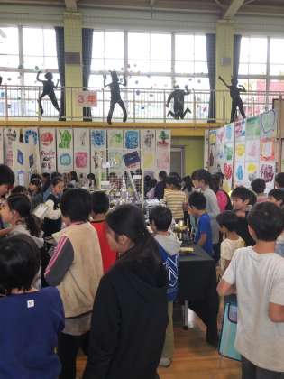 体育館があっと言う前に美術館に変わりました。今日は5年生とペアでの鑑賞。互いに作品の良いところ探しをしながら観ます。