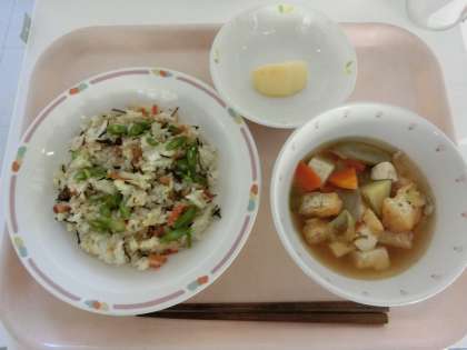 「もち米が入っているから食感が違うよ、よく噛んでみてね」と言うと、子どもは少し真剣にもぐもぐした後「いつもと違うかな」「もちもちしてる」「ちょっとべったりするかも?」などそれぞれの感想を口にしていました。どうしても自分の感覚で「献立名や見た目からわかることを口にするとしつこいかな…?」と不安なるのですが、改めて言葉で伝えることで気づく子どもはぐっと増えるんだなと感じました。やはり伝えたいことはどんどん言葉にしていこうと思います!