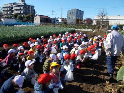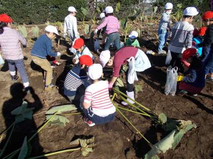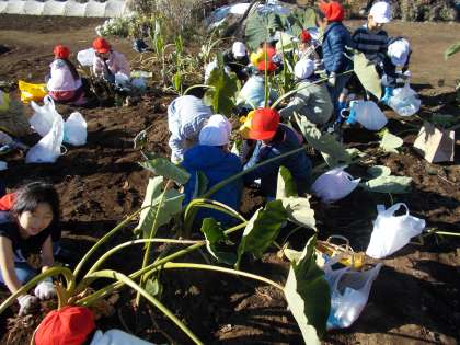 千歳台小学校の学区内にある、塩野農園さんの畑に行き、「里芋掘り」を体験してきました。塩野さんから、里芋の抜き方を教わり、国語で学習した「おおきなかぶ」のように、「うんとこしょ!どっこいしょ!」みんなで力を合わせて抜きました。袋いっぱいになるくらい里芋を収穫しました。後日、里芋パーティでおいしくいただきます!