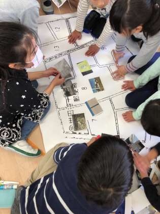 先日のフィールドワークに基づいていよいよ安全マップづくりを始めました。まずは場所と写真の確認から。説明も相談しながら書いていきます。