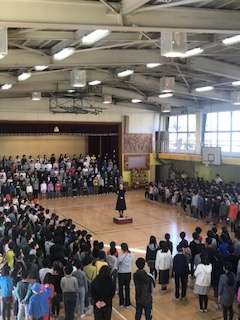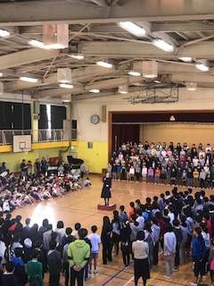 4年生のお手本を見せてもらって、全員で『音楽の贈り物』を合唱しました。気持ちのいい一日のスタートになりました。