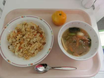 今日の果物はみかんです。温州みかんの季節といえば冬のイメージがありますが、9月ごろからすでに極早生の品種が出回るようになります。給食ではぶどうやなしといった、シーズンの短い果物を優先して献立に加えていたので、今日が今年度最初のみかんになりました。甘みがしっかりしていて、辛いチャーハンを食べた後にぴったりのデザートになりました。