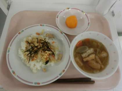 今日は親子丼です。給食では中までしっかり火を通さなければいけないので、卵は半熟とはいかないのですが、それでもなるべくふわふわに仕上がるように給食室では慎重に調理をしてもらいました。丼ものということでどのクラスでもおかわりが盛況で、中には「ごはんをもっとください!」というクラスや、余っているのりを山盛りにしている子もいました。