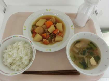今日はカレー味の肉じゃがです。普段の肉じゃがの甘辛さとカレー粉の香りがマッチした、おいしくて不思議な味わいです。子どもたちは「カレーみたいでおいしい!」「スパイシーだ!」と喜んで食べていました。おかわりにも列ができ、残りがちな白飯もあっという間になくなっていました。